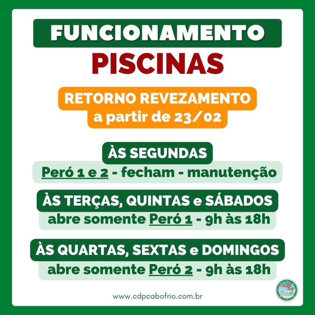 Atenção ao funcionamento das PISCINAS a partir da semana que vem: será retomado o revezamento de abertura entre os complexos do Peró 1 e do Peró 2. O horário de fechamento que voltaria para 17h, seguirá até 18h por mais um período. A abertura segue a partir de 9h. Confira o cronograma a partir de segunda […]