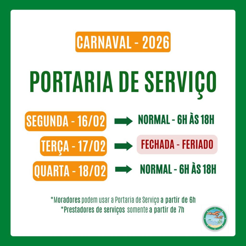 As SAUNAS do condomínio irão funcionar normalmente nesta semana de carnaval. Não haverá diferenciação na abertura devido ao ferido. Segue o cronograma: SAUNA MISTA (Peró 2) – abre de terça a domingo (19h às 22h) SAUNA FEMININA (Peró 1) – abre às terças E sábados (19h às 22h) Hoje (segunda – 16/02) não haverá nenhuma […]