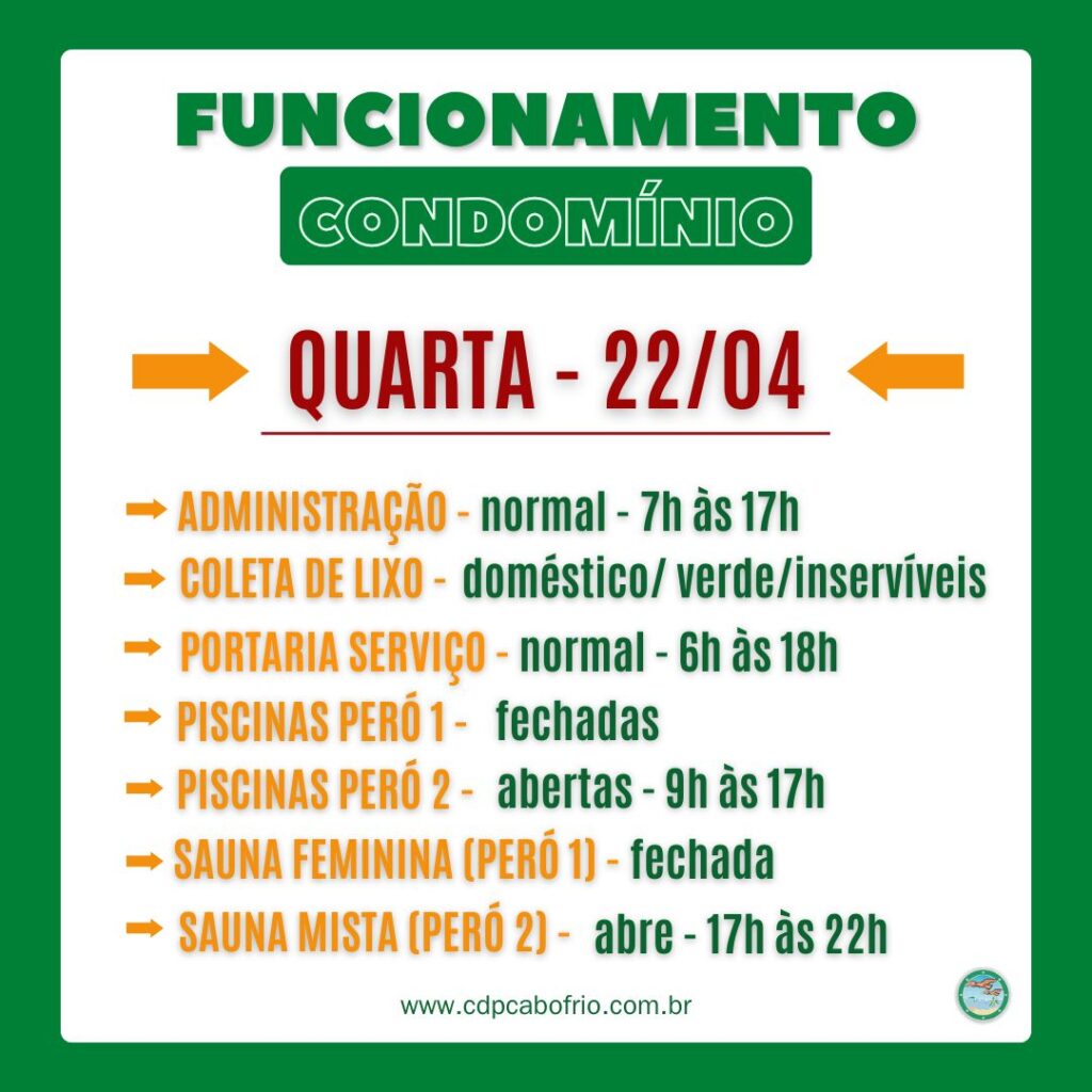 As PISCINAS (Peró 1 e Peró 2) funcionarão no sistema normal de revezamento nesta semana de 2 feriados (21/04 – Dia de Tiradentes e 23/04 – Dia de São Jorge – padroeiro do Estado do Rio). Hoje (segunda – 20/04) nenhum complexo abre devido a limpeza semanal. Confira abaixo, o rodízio de terça a domingo: TERÇA, […]