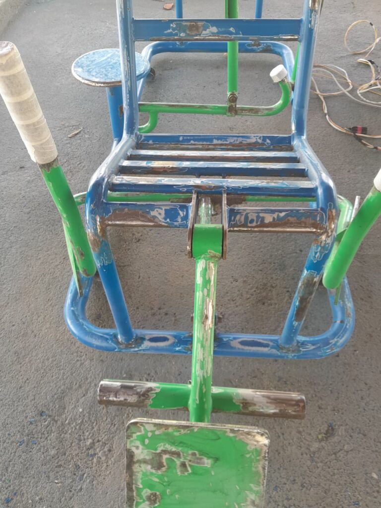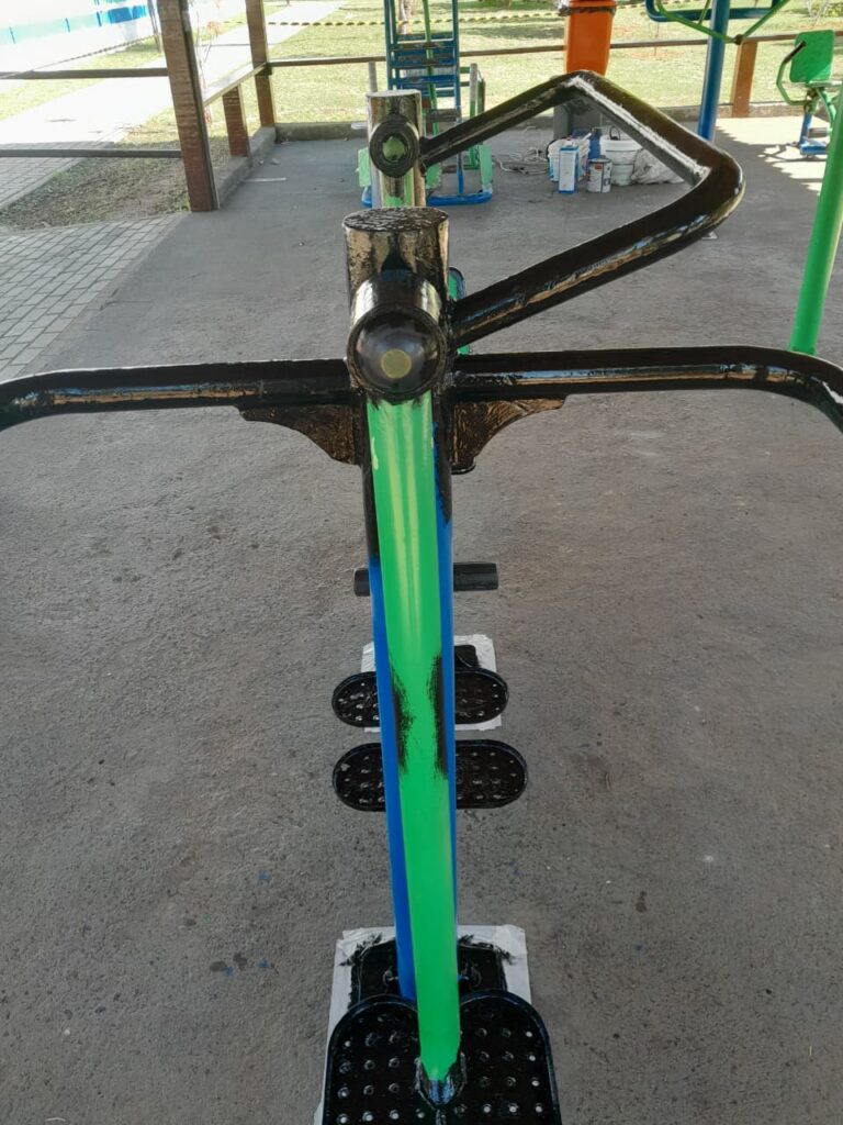 A fase agora é de pintura dos equipamentos. Primeiramente, os aparelhos são lixados e depois ganham a cor.