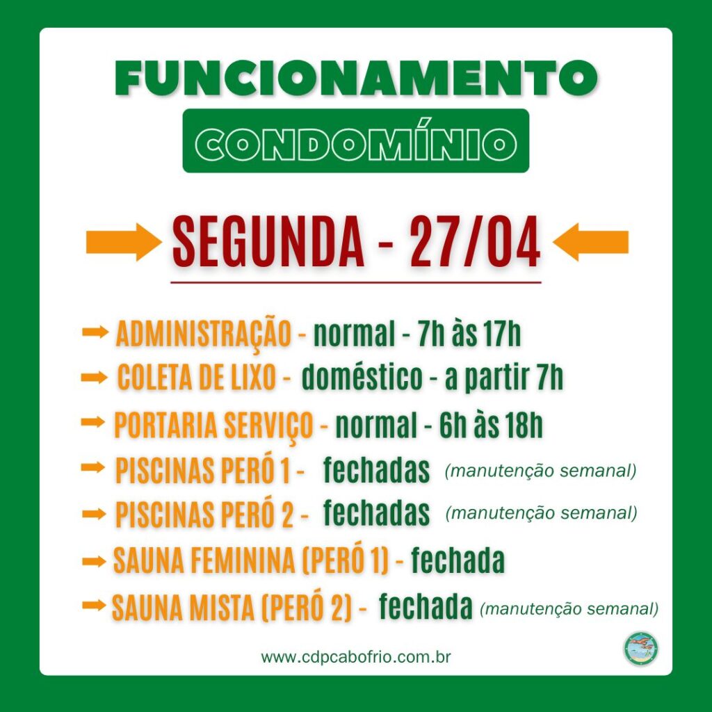 Fique atento (a) ao funcionamento do condomínio nesta segunda-feira (27/04):