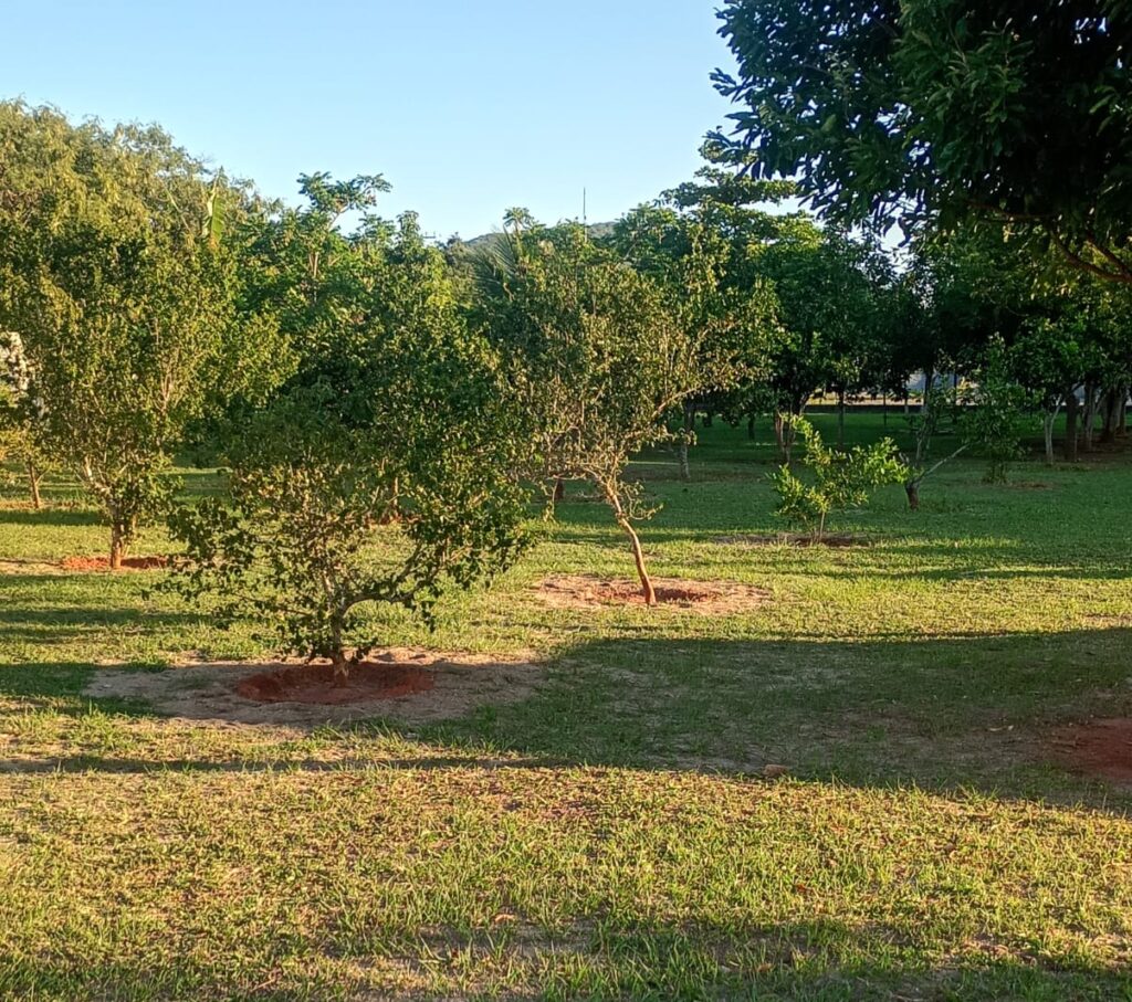 Entre as manutenções da semana, teve cuidado na área verde do Peró 1 (perto do Salão de Jogos) e no Pomar do condomínio (que também fica no Peró 1).
