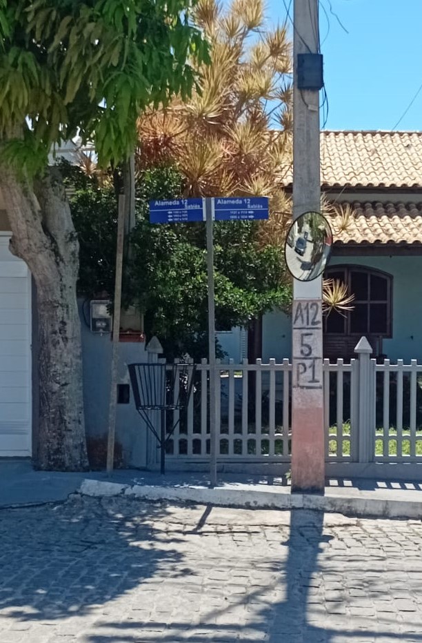 Peró 1 – espelho instalado no poste n° 5 da alameda 12 – esquina com a alameda 13 (pra auxiliar condutores quem vem da portaria 1 e da alameda 13)