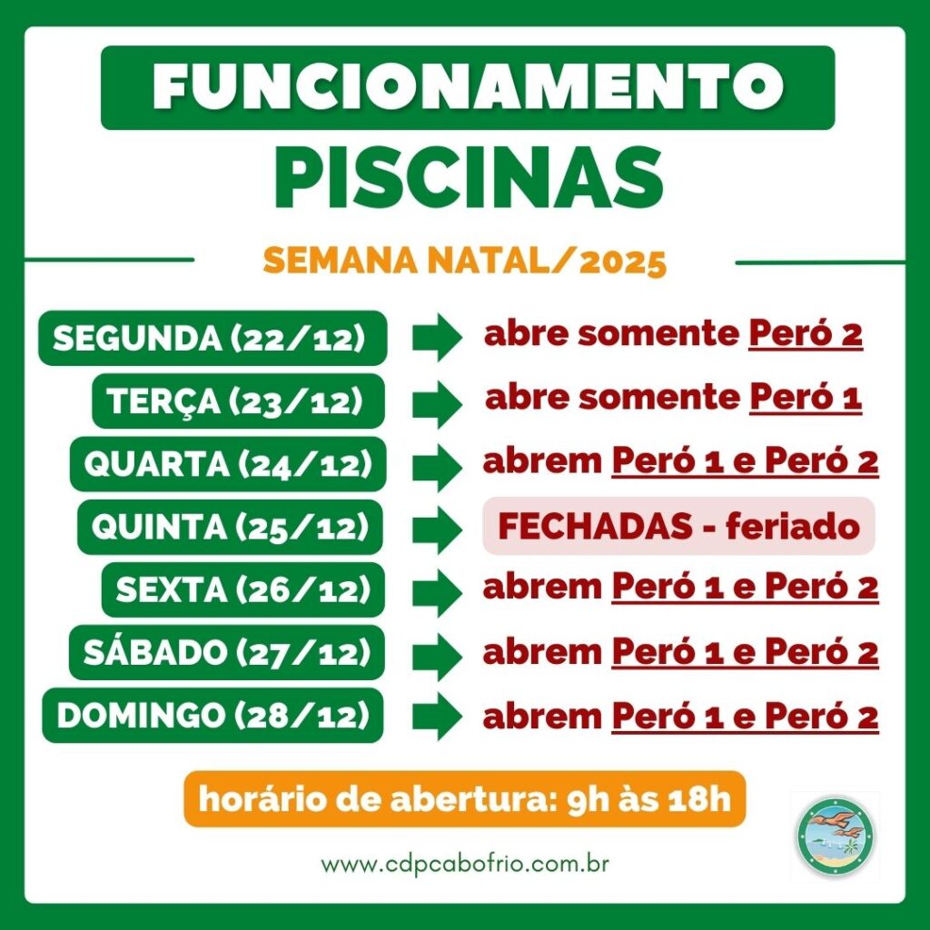 Os dois complexos de PISCINAS estarão fechados no dia de Natal (25/12).