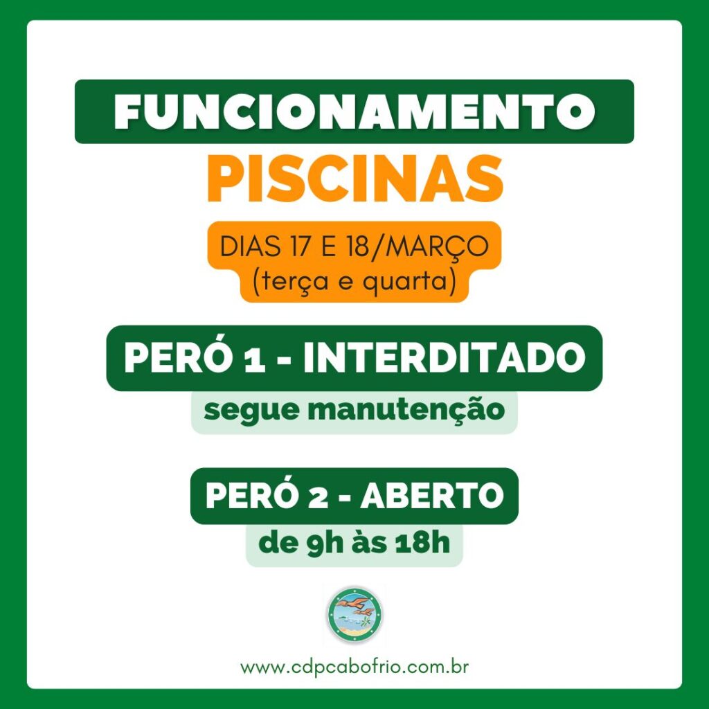 Portanto, nesta terça-feira (17) e quarta-feira (18) estará aberto somente o complexo de Piscinas do Peró 2 (de 9h às 18h).